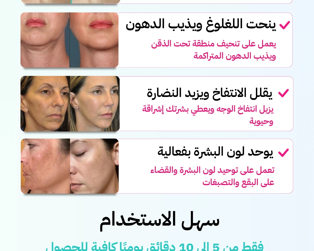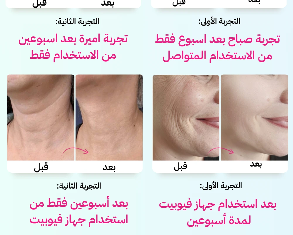 ما تتخيلون فرحتي الجهاز ذا غير حياتي حرفيًا اللغلوغ راح والبشرة صارت مشدودة بدون مشاكل ولا تعب جد شكرًا لكم الحمد الله نسيت فكرة العيادات و العمليات